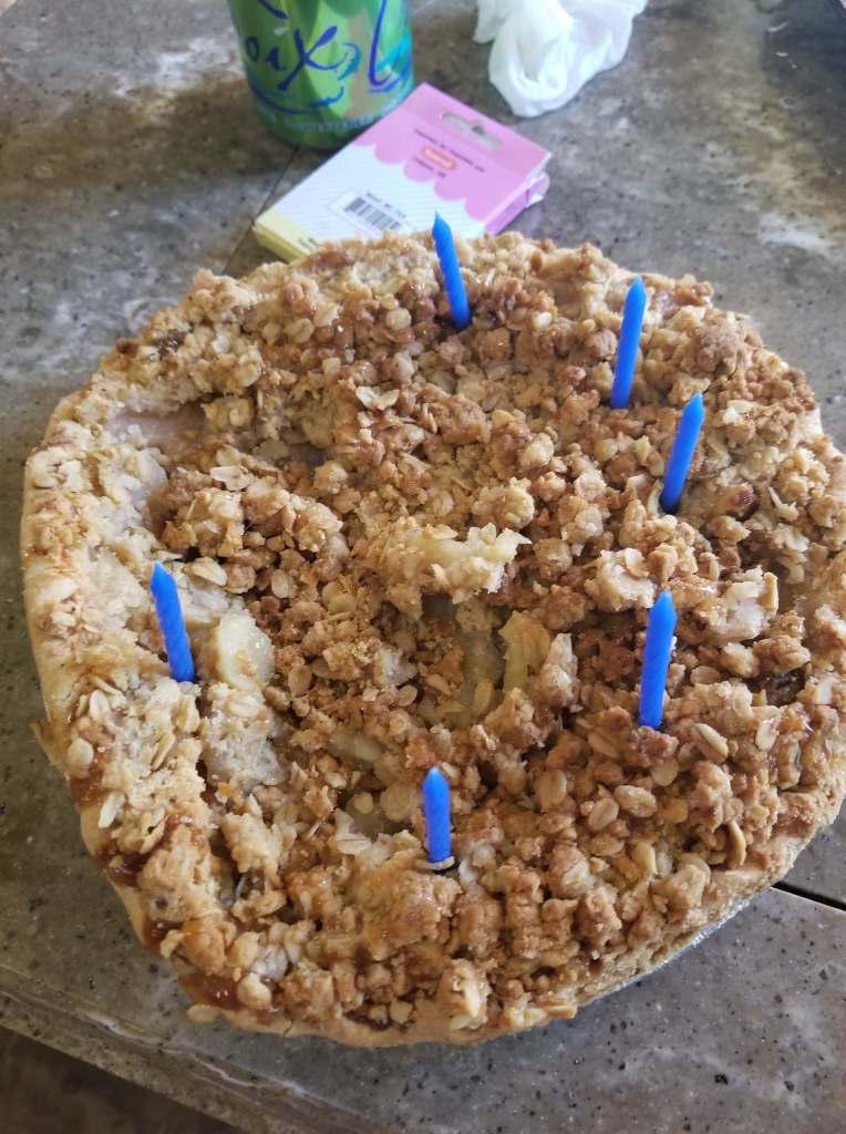 I walk in the trailer and see a line of crumbs that lead to our bedroom and I find the kids huddled in the closet with this darn pie. They each had a fork and were going to town!! HAHAHAHA.
