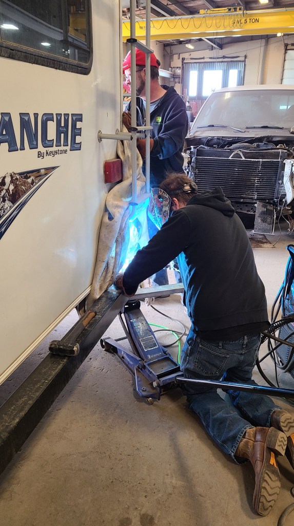 12:00 pm – We arrive at Nick’s shop and the Dunphy Family saves the day!! Will and his son, Austin, come to our rescue and weld up the bumper. Good to Go!!