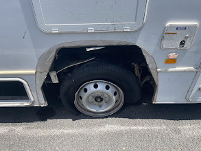This is our second time experiencing a tire blow out and it’s incredible how much damage they can cause. This time it ripped the door off one of the storage compartments, there was nothing left of the fender skirt, bent the rim and the tire was annihilated.