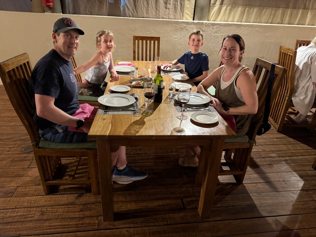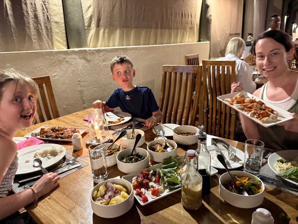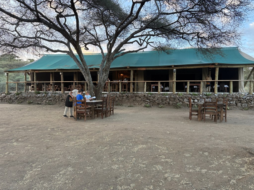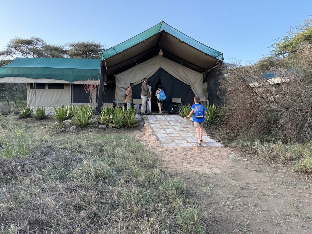 We stayed at the Southern Serengeti Woodlands Camp for 3 nights and it was our favourite!! The tents were great, the food was awesome but the people are the heart and soul of this place!!! They went the extra mile for us and especially the kiddos. We had giraffes roaming around while the kids played soccer. It’s a humbling experience staying in a tent when you can hear the lions roaring at night along with all the other animal activity. Not to worry, we felt totally safe because they had Masai Warriors standing guard!! The rules are the same in all the camps, when dusk hits, you cannot walk around on your own – you must be escorted to and from your tent!!